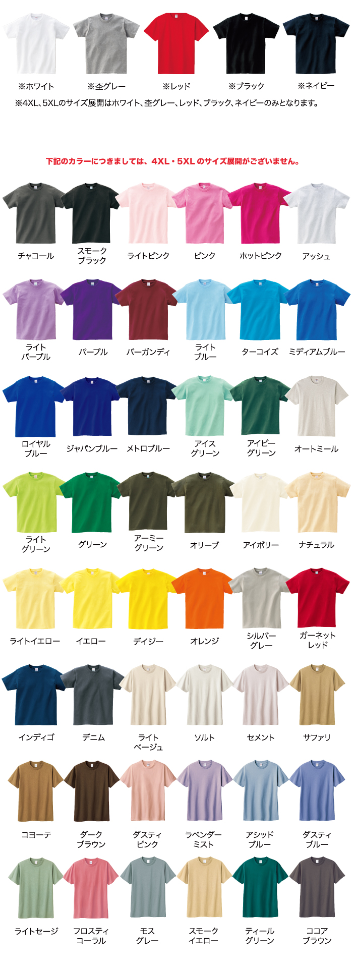 ※4XL、5XLのサイズ展開はホワイト、杢グレー、レッド、ブラック、ネイビーのみとなります。